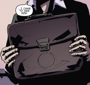 In the second part, let’s state this as the well-known phrase goes, we go back to Frank Black! The return of the beloved character from Milllennium had been teased at the end of the first issue (“Next issue: Millennial visions“) and Harris had promised a surprise guest star; unfortunately his identity was spoiled in advance of reading the actual issue #17 by the delay in its release; as a result, Frank Black was discussed in the New York Comic Con on October 10. In #17, Frank Black and his visions and his trademark coat are back; and this is the first we see of him in 14 years! A bit like in the cross-over episode 7X04: Millennium, we have Frank and Mulder discussing while Scully is investigating on her side, with autopsies and, as often happens, discussions with priests. We also see a briefcase with the Millennium Group ouroboros on it, like in the series finale 3×22: Goodbye To All That. And the story develops into a case of satanic possession, domestic terrorism and cult group mass suicide.