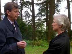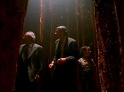We know that the CSM is very selfish and is known to place personal interests over those of the Syndicate (the DAT tape case in 3X02: Paper Clip). When Jeremiah senses that the CSM has lung cancer, the CSM prefers not to take any risks and let himself be healed, even if that means releasing Jeremiah and endangering the Project. The Cancer Man is no more! (at least for a little while given his puffing rate) But we see a whole new side of him with his conversation with Fox’s mom at the Mulders’ cottage in Quonochontaug, Rhode Island. This meeting has many insinuations and implications; the CSM is surprisingly poetic and self-praising to Teena (“He was a good water-skier, your husband. Not as good as I was, but… that could be said about so many things…“). “We used to have so much to say to each other. So many good times at the Mulders’ summer place. Your kids, young and energetic.“: the CSM and Teena seem to have had an affair back in the ’60s-’70s, probably on Bill’s back. And what ups the ante even more is the CSM’s near-confession to Mulder: “I’ve known your mother since before you were born, Fox.” Note the use of “Fox” while usually he refers to him as “Agent Mulder“. The big villain as the hero’s father? The identity of Fox Mulder’s father will be hinted one way and the other for several episodes before finally setting on good old C.G.B. Spender (7X04: Amor Fati). The CSM is upset with Teena’s condition, he visits her at the hospital, stands by her bedside, looks at her with sorrow. But he doesn’t want any of his real feelings to be known. He keeps his face straight to the First Elder. As Mulder failed to have Jeremiah do it, the CSM asks the ABH to heal her and comes up with the excuse of “the fiercest enemy is the man who has nothing left to lose” to justify this. Behind this cold conspirator we know, there are feelings and fears.