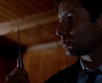 In 2X17: End Game we were told that an Alien Bounty Hunter could be killed with a simple gunshot to the base of the neck (that is not so certain), but that the stiletto is necessary for a hybrid. This isn’t inconsistent with what happens in Herrenvolk. Mulder & Scully don’t use their guns against the ABH in fear of being exposed to the toxin in the ‘green ‘blood’ (“You can’t use your gun!“). Mulder attempts to kill the ABH using his stiletto instead, but apparently misses the critical spot (he aimed too low, to the top of the back, but close enough to knock him out). Even if no established rules are broken, this is somewhat confusing.