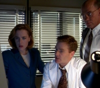 A renegade cloned hybrid that can shapeshift and heal, Jeremiah Smith, tries to thwart the Syndicate’s greater Project that involves a colonization. After a meeting between the Cigarette-Smoking Man and Teena Mulder (Fox’s mom) that reveals a past connection and ends up in Teena having a stroke, Mulder finds an alien stiletto. Unable to use the stiletto against Jeremiah, the CSM calls for the Alien Bounty Hunter’s help. Jeremiah escapes and asks for Mulder & Scully’s help. The ABH hunts Mulder & Jeremiah while Scully discovers that the american population is being catalogued through smallpox vaccinations. Before being stopped by the ABH, Jeremiah shows Mulder transgenic plantations and hives of killer bees taken care of by young clones of Samantha. The Syndicate learns X is Mulder’s source and kills him; before dying, X points Mulder to his next source: Special Representative to the Secretary General of the UN Marita Covarrubias. The CSM summons the ABH’s help to heal Teena.