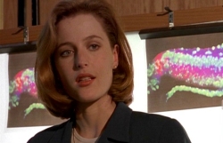 The second strain of 3 letters and 12 numbers does not repeat itself, “each one is different, an infinite number of variations” (well, not exactly infinite: 17,576e15 variations to be exact, but compared to the world population it should be enough :)). Scully experiments on herself and the more-than-eager Pendrell: “I had a biopsy taken from the smallpox vaccination scar on my upper arm“, and through a process called immunohistochemical staining, she was able to obtain the “three-dimensional picture of the