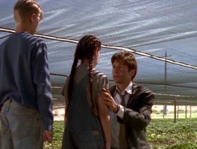 So what do we learn of the nature of the Project after all? Jeremiah takes Mulder to the Canadian (Alberta) countryside. In the middle of nowhere, there are fields of flowers of a species unknown to biologists according to Jeremiah. Bees fly around the flowers unhindered. Giant bee apiaries stand next to the fields. The “agrarian workforce” is composed of several young hybrid clones of Samantha and of a blond boy (young clones of Kurt Crawford, as we learn in 4X15: Memento Mori), all created from “serial ovotypes“, Jeremiah specifies, ie created by batches. Their single task is to take care of the fields and bees; they are self-sufficient; a very American Gothic-like atmosphere permeates the farm settlement. “You’re looking at the future, Mr Mulder.” Of course nothing of this makes sense yet, but in light of Fight the Future, we understand. Jeremiah says the flowers are grown for their “pollen“; the bees pollinate the flowers and carry some of their pollen with them. As the very rapid death of the electricity company repairman shows, these bees are deadly, carrying a very toxic substance. This could be the alien virus as in Fight the Future, but it’s more likely a very deadly strain of the smallpox virus, as in 4X21: Zero Sum; the cable repairman who is stung dies and doesn’t gestate an alien. Jeremiah, the Samantha clones and the ABH are immune to its effects, just as they must be able to heal themselves; Mulder is not, and to prevent him being stung he covers himself in gas. Marita tells Mulder the flowers were identified as ginseng; so these are genetically modified ginseng, modified to carry an artificially created deadly strain of smallpox. The concept of bees carrying a virus and spread to the population is the heart of the Project as Mulder will learn later on. As the ABH says, “He [Jeremiah] shows you pieces, but tells you nothing of the whole“.