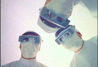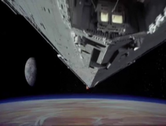 the first “Star Wars”: a low angle shot of a spaceship entering the