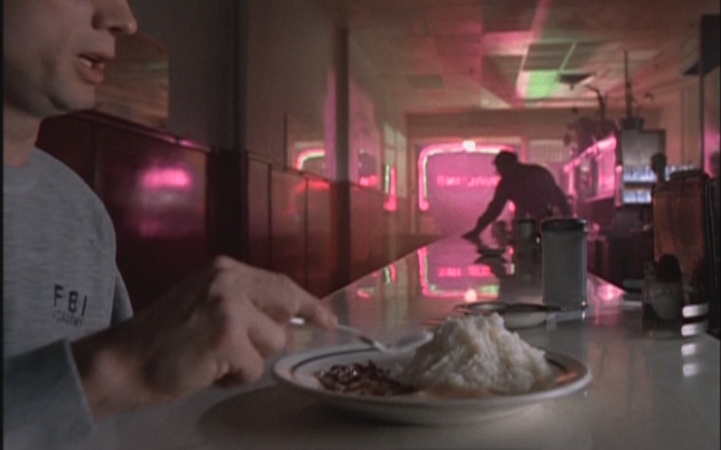 Mulder repeatedly enters the diner and orders a cherry pie. The setting