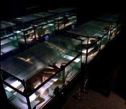 The hybrids Dr. Berube’s project is called Purity Control and deals with mixing alien and human DNA through gene therapy. Doing God’s work, and what better name for the lab where the experiments took place than Zeus Storage, in Pandora Street? However, Berube wasn’t aware he was working for the Syndicate as his surprise at the appearence of the Crew Cut Man indicates (“If you’re from the FBI, I’ve already answered all your questions! […] Please, my work is very important. I must get on with my work.“). Officially, he worked for the Human Genome Project, an (real) ambitious scientific program that worked for “the mapping of all human genes“. Being manipulated by the Syndicate that provided him with the Purity Control material, he always thought that his work wasn’t alien/human hybridization but a project for the good of science. Dr. Berube experimented on monkeys, but his work was so successful that he was sure enough to test it on humans. It cured the cancer of his friend Dr. Secare; the other 5 subjects were probably acquaintances too. The water tanks with the hybrid bodies inside will be seen again (2X16: Colony, 4X15: Memento Mori); this seems to be a part of the growing process of a hybrid (be it a clone or issued from gene therapy). But his work was going too fast, and the secret agenda of the Syndicate is not to attain a succssful hybrid too soon (6X11: Two Fathers); hence the Crew Cut Man, who is sent to slow Berube down. Each group of hybrids we encounter throughout the series is different from one another. With these hybrids are introduced many elements that will be kept as canon, such as the ability to breathe underwater and their green toxic blood. Dr. Secare still bleeds after hiding underwater: these hybrids don’t have the ability to heal themselves. Secare is killed from a gunshot wound to the base of the neck, no stiletto is needed here: these hybrids are still quite imperfect. Deep Throat’s demise Deep Throat says this was the “first DNA transplant, the first human/alien hybrid“; we know this to be somewhat false (2X25: Anasazi). DT means this was the first time the experiments were so successful, because they definitely are an improvement: the hybrids can survive, they have human physiology and can live normal lives without drawbacks (3X01: The Blessing Way, 3X10: 731), they are very close to a successful hybrid. Or maybe this was the first time this technique was used: DT explains we didn’t have the technology to make gene therapy up until then, previous experiments were either unsuccessful (The Blessing Way) or didn’t consist of gene therapy (the cloned hybrids). It is very likely that DT has been deceived and that his information is false. This episode tells of the demise of DT, he could have purposely been lied to in order to isolate him; his loyalty is in doubt since 1X09: Fallen Angel and he’s being watched since 1X16: E.B.E.. DT does say “There are limits to my knowledge, Mr. Mulder.”, and his knowledge on hybridization experiments seems very limited.