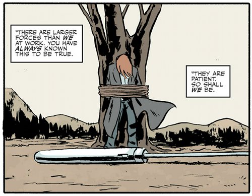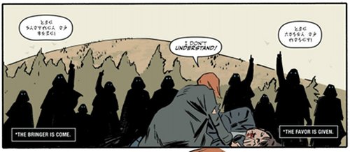 The objective of the Acolytes was to bring (“Usher“) Scully, the “Bringer” (i.e. the one who brought William to the world) to Yellowstone, where she would have been sacrificed as an offering — the “Favor” — to the alien Colonists, who hold an underground craft there. The Acolytes would have sacrificed Scully sooner (in issue #2) but the Deacon prevented them, wanting to do it himself later.