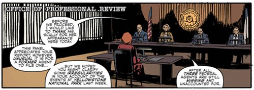 The scene with Scully testifying in front of the FBI’s Office of Professional Review (OPR) is exactly like in Fight The Future (yet another callback to the movie in this issue!), even down to the head reviewer who for all we know could still be the same person, A.D. Cassidy.