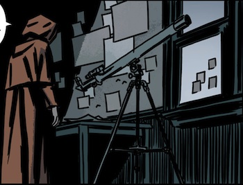 Instead of killing them, the Acolytes have held them captive for long months in the basement of a house in North Dakota, with a single shape-shifting Acolyte holding guard. The third FBI Agent that went missing along with Reyes is nowhere to be seen — the Acolytes had no use for her? The Acolyte has been watching the sky with a telescope and maps of stars, waiting for “a sign“, “for instruction“, most likely from his alien masters (this passion for astrology is reminiscent of the possibly alchemical symbols connected with the Acolytes, see #2). The instruction comes in the form of an alien stiletto, to kill the Acolyte and free the prisoners; the Acolytes don’t seem to value much their own lives, and the aliens must be treating them as disposable slaves, keeping with the role the alien/human hybrids have had in the past. The Acolyte was also referring to something Doggett & Reyes should have understood while they were there all this time (“you don’t see it yet, do you?“); maybe this is his religious rapture of how awesomely superior the alien Colonists are, maybe he is referring to something more precise related to his observations of the stars and the arrival of the aliens (“they’ll be here soon“).
