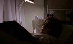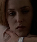 Scully’s log 3: “I have not written to you in the last 24 hours because the treatment has weakened my spirit as well as my body. Mulder, it’s difficult to describe to you the fear of facing an enemy which I can neither conquer nor escape. Penny Northern has taken a downturn. I now look at her with a respect that can only come from one who is about to walk the same dark path. Seeing her I can’t help but see myself in a month or a year. I pray that I have her courage to face this journey. Mulder, I feel you close though I know you are now pursuing your own path. For that I am grateful, more than I could ever express. I need to know you’re out there if I am ever to see through this.” Mulder: “When I came to find you, you weren’t in your room. I got scared that something had happened…and I read some of what you wrote.” |