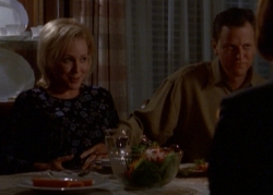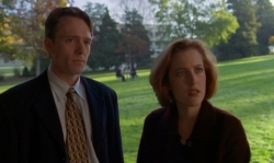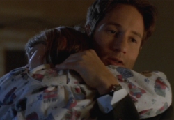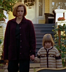 – The fact that the hybrids are mind-readers discards any possibility of manipulation: Calderon would know if those were Alien Bouny Hunters he was dealing with. And given the rebellious nature of the hybrids-as-workforce, he’d make it known at least to the Syndicate. For the same reason of mind-reading, the shapeshifting Calderon’s superiors could not be manipulated by the alien Colonists into thinking that they’re working for the Syndicate when in fact they’re working for the aliens’ secret agenda. A hybrid would know the truth. Emily is a Syndicate-led effort, part of the Syndicate’s hybridization experiments. The bottom line is that Christmas Carol/Emily do not add many new mytharc elements to an otherwise everexpanding hazy Syndicate — these are emotional episodes building on pre-existing mythology ground. Couple that with a storyline that is very hard to interpret in detail, and it can be understood why these episodes are often put aside when the Syndicate mythology is described. The pain of Scully This is an extremely emotional arc for Scully. Mulder takes this personally more than he would like to show to Scully (see how he explodes in violence in Dr. Calderon’s office). We get to know the Scullys much better. Margaret Scully must be glad to become a grandmother with the birth of little Matthew, son of Bill Jr. and Tara; with Melissa dead and Dana barren (and Charles, well, unaccounted for), the difficulty that Bill & Tara had to conceive must have been hard. Bill & Tara Scully live in San Diego, in the same neighbourhood the Scullys lived in when Bill, Dana and Melissa were younger. Dana reminds herself of family moments, like when she had visited Commander Johansen in San Diego (3X15: Piper Maru).