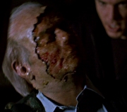It is also no surprise that the Rebels can shapeshift like the Alien Bounty Hunter can. What we see for the first time is this sort of ‘prosthetic face’ the Rebels carry over their normal face, this layer of skin that we see being torn off like modelling clay. We thought that the Rebels, the Alien Bounty Hunter and the hybrids could shapeshift, change their physical shape by deforming their bodies and taking over another’s appearance; here the extra face looks like a prosthetic mask that can be of only one form, a mask independent of the body. But as we see at the end of One Son, a Rebel shapeshifts from the human face he had to that beneath this prosthetic face, the appearance of a faceless Rebel with sealed eyes and mouth. So this prosthetic does seem to be part of their bodies: a layer of skin that can be modelled at will and that can be regrown (a bit like Eddie Van Blundht’s thin layer of muscle tissue covering his skin from 4X20: Small Potatoes!). Under this skin, the Rebels have a ‘base face’, their true face. In The Red and the Black we had only seen a Rebel militia that appeared to be clones with a similar appearance as the Alien Bounty Hunter (actor Brian Thomson); here we meet more representatives of this race. We do not know much of alien (or hybrid) biology, it is very possible that this ‘prosthetic face’ deal has been true since the beginning and that it’s not an apparently contradictory visual effect added on these episodes on the fly.