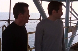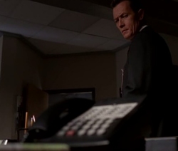 Doggett: “Five years ago, you and Agent Scully investigated a case of a World War Two plane salvaged from the bottom of the Pacific Ocean, where a sepsis was brought to the surface which you describe as a highly contagious virus of extraterrestrial origin that has radioactive properties and can take over a man’s body and it’s part of an alien conspiracy to colonise the planet, if I’m not mistaken.” Doggett: “I never would have believed it. These stories about you.” Scully: “And what if I can’t?” Diego Garza: “Confio en nadie.” [I trust no one] Mulder: “You’re all the credibility this office has left. You have Kersh’s ear and you have seen it now. Out on that platform. You saw it for yourself. (phone rings, it’s Kersh) Answer the phone, Agent Doggett. You’re in charge here now.” (Mulder shakes Doggett’s hand and walks out the X-Files office for good; the phone keeps ringing as Doggett looks at it) |