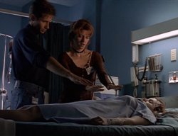 visit, CSM must have moved. Skinner had an out-of-body experience, that makes him somewhat open to the paranormal. Skinner's experiences in Vietnam will be toughed upon again (3X21: Avatar). We meet Melissa, the whole contrary of her sister (New Age believer). Melissa & Margaret insist on calling Mulder "Fox". Finally, Melissa convinces Mulder to stay at Scully's bedside rather than give way to anger and revenge and, at X's advice, kill those who searched his apartment. Nurse Owens is Scully's guardian angel; during the episode she interacted with nobody else except Dana. One could think Nurse Owens is a Walk-in (7X11: Closure), taking care of those who suffer. In 2X07: 3, Mulder turns the calendar to November; Duane Barry's hostage situation was on August 7. Scully's been missing for at least 3 months, but it will be said that she was missing for 4 weeks later in the series (5X07: Emily).