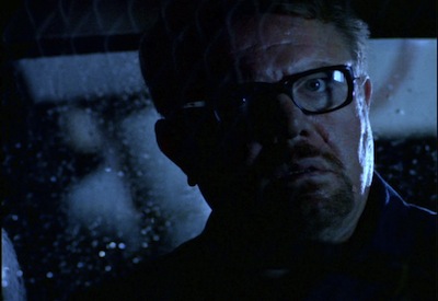 The cinematography used when Mulder witnesses the UFO emerging from behind the building and passing overhead is reminiscent, again, of “Close Encounters”: the darkness at first, the blinding emergence of the ship’s lights, the light/dark contrasts, the overexposure. Producer Paul Rabwin describes his thinking behind realizing the special effects for the episode in the making of featurette in the “Threads of Mythology” DVDs: