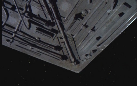 The opening shot of the episode is a reference to the opening shot of the first “Star Wars”: a low angle shot of a spaceship entering the frame from above, slowly gliding forward, the shot making evident the important size of the craft. The exact same setup is used in the episode, complete with what appears to be a triangular form of the craft, until it is revealed that this is not a craft at all but the below side of an electric crane lift.