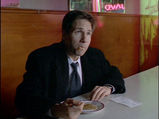 In Jose Chung… Mulder sits down at the lunch counter and winds up eating a whole ‘sweet potato pie’ in one sitting, NOT cherry pie. Y”a, I’ve watched this too many times…
