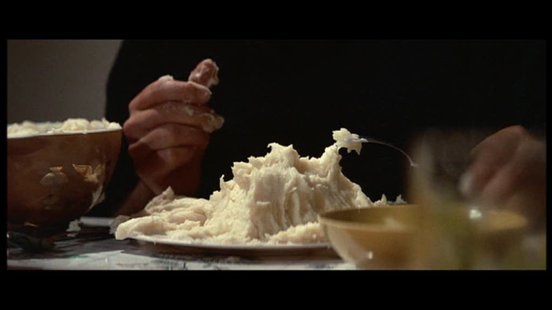 The military pilot Mulder collects from the street is seen toying with his mashed potatoes in the diner: he forms a mound that he shapes with his fork. This is lifted from “Close Encounters”, where the main character is obsessed with a UFO encounter he’s had and has images of a shape of a mountain in his head; in a family dinner, he shapes his mashed potatoes like a mountain. The mountain turns out to be Devils Tower, with its characteristic shape, where the climactic close encounter occurs.
