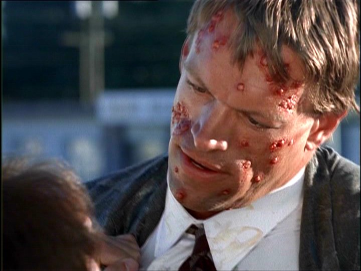 More of a case of budget optimization than a cinema reference, the Level 4 hazmat suits that Scully, Pendrell and Dr Sack use in this episode and the next are the same suits featured in “Outbreak”, used by Dustin Hoffman, Rene Russo and Cuba Gooding Jr. Released in March 1995, i.e. about a year and a half before Tunguska was shot, “Outbreak” used suits designed by Erica Phillips from Global Effects Inc.; the X-Files crew must have re-used them to minimize expenses. The film itself has a very X-Files-like story: the military and civilian response to the outbreak of a highly contagious and deadly virus (the fictional virus Motaba), featuring USAMRIID and CDC doctors as protagonists.