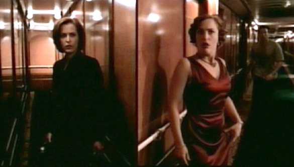 How not to think of “Titanic” when considering scenes happening on an early 20th century boat? Back when this episode was made, “Titanic”’s huge commercial success about a year before was still fresh in everybody’s memories. Notably, 1939-Scully’s dress is very similar to Rose’s (Kate Winslet) red dress from the movie.
