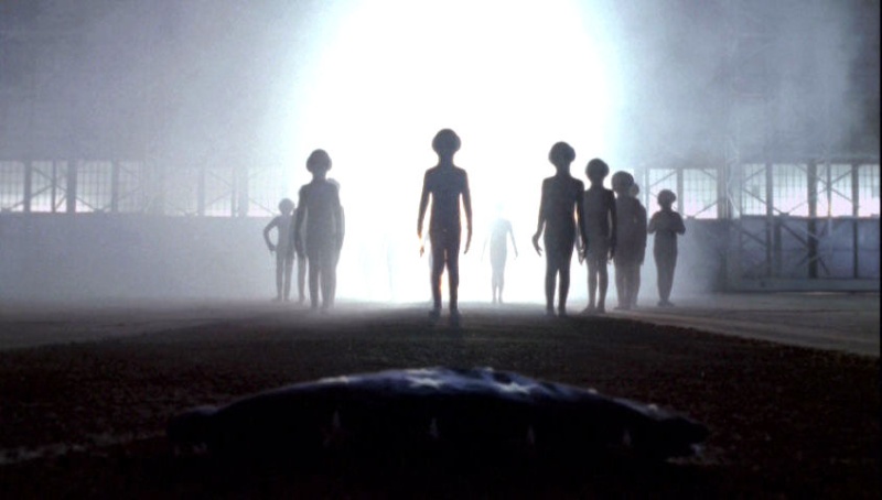 In the flashback scene where the Syndicate first meets the aliens in 1973, the way the aliens are presented, forming a line one next to each other and coming from a light source behind, is similar to the way we first see the aliens in “Close Encounters”. The high contrast that is created from the intense light source associated with UFOs and the silhouettes of the aliens serves to minimize how much of the aliens we, the audience, get to see, and also presents the aliens like a superior, angelic, higher form of life.